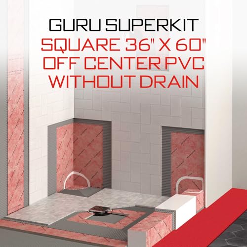 GURU USA SuperKit Square Shower Kit with Heavy Duty Tray, Water-Stop Membrane Roll, & Hair Strainer, Bathroom Accessories Set without Drain, 36″ x 60″, Off-Center Drain, PVC Connector
